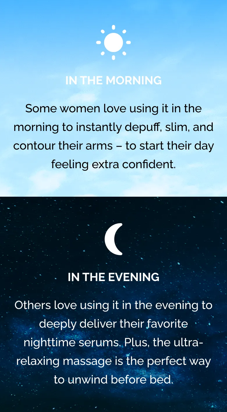 The ultra-relaxing and uplifting sonic massage helps melt away stress or tension in the arms.